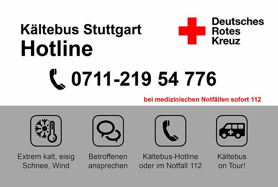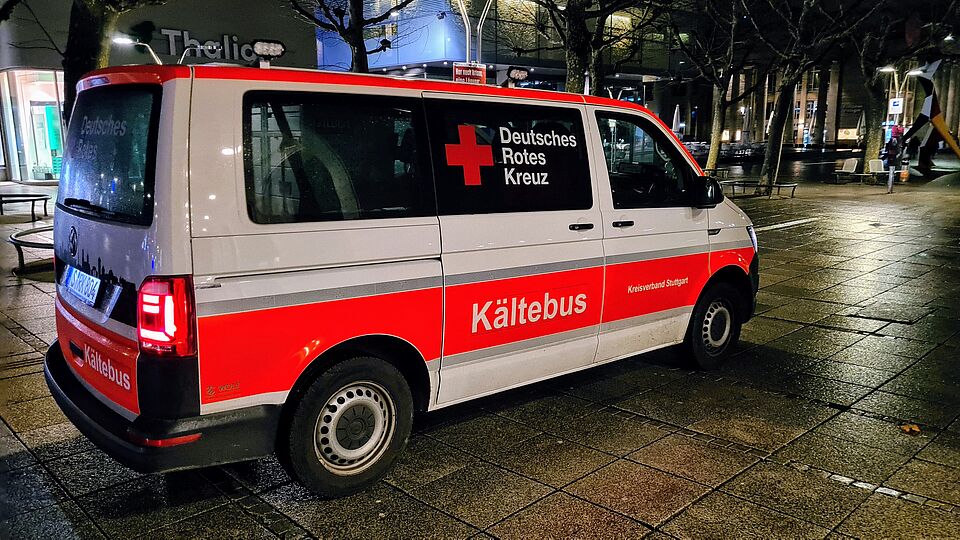 Foto: DRK Stuttgart-NordSeit Dezember 2013 stellt der DRK Kreisverband Stuttgart e.V. mit einem eigenen Fahrzeug und ehrenamtlichen Helferinnen und Helfern den Kältebus in Stuttgart. Der Kältebus unterstützt hilfsbedürftige wohnungslose Menschen im gesamten Stadtgebiet und kommt in den Wintermonaten von Dezember bis Februar bei Temperaturen ab 0°C zum Einsatz.